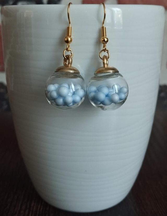 Chaque pièce est composée d’une sphère en verre transparent renfermant de délicates billes bleues, créant un effet lumineux et raffiné.