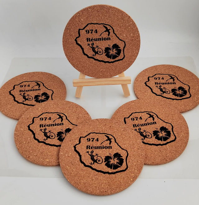 Vends un lot de 6 dessous de verre en liège, diamètre 10 cm, décorés du motif de l’île de la Martinique.