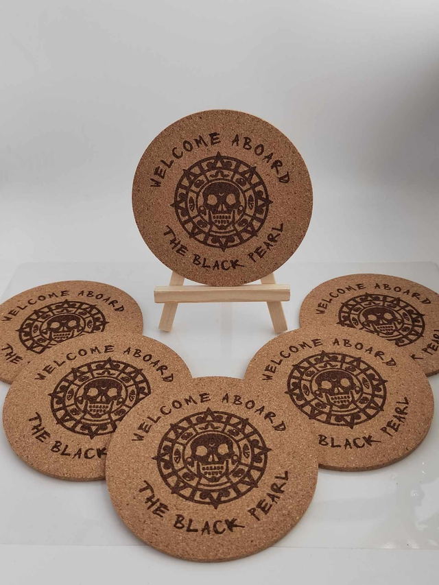 Ce set de 6 dessous de verre en liège de 10 cm de diamètre est décoré sur le thème Pirates des Caraïbes.